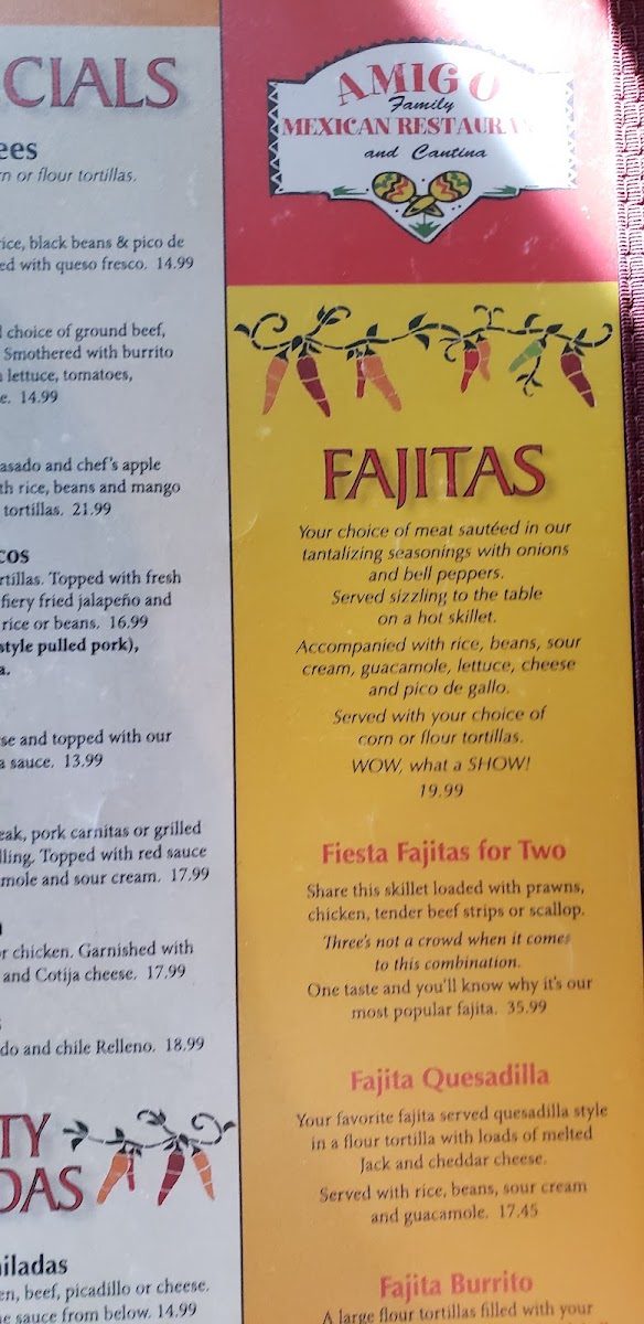 Don't miss their lunch specials featuring Deluxe Nachos and Macho Burritos, which serve generous portions perfect for sharing. The atmosphere is vibrant, with ample seating options including an inviting outdoor space, ideal for family gatherings or pre-movie dinners. Patrons rave about the attentive service, ensuring every visit feels special. Whether indulging in sizzling Fajitas or enjoying refreshing cocktails, your experience at Amigo's promises to be memorable, leaving you with a satisfied belly and a smile.